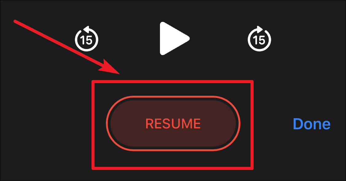 Drag the Playhead to the end of the recording. The ‘Resume’ option will be visible on the screen when the playhead is at the end of the memo. Tap on it to add further to the recording.