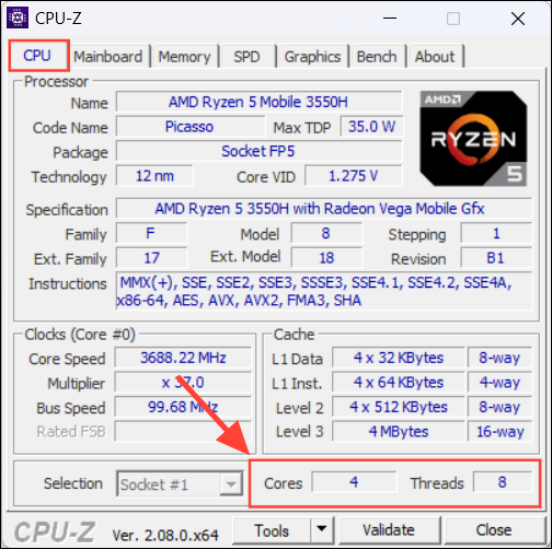 - Look at the bottom right corner to see the number of cores and threads.