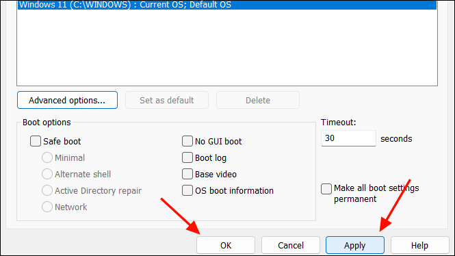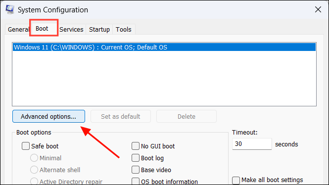 - In the System Configuration window, head to the 'Boot' tab and click on the 'Advanced Options' button. This will open another window.