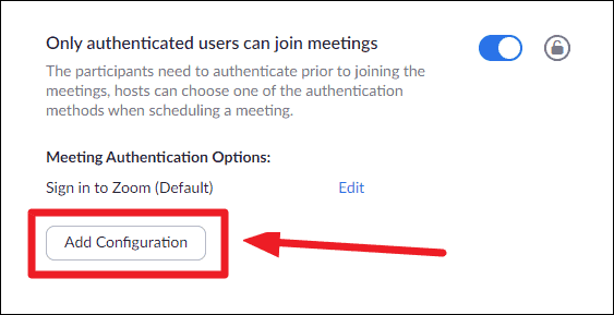 Optional: You may also configure additional meeting authentication options by clicking on the "Add Configuration" button. This allows you to restrict meeting access to users with specific domains, such as your company's email domain, enhancing the security of your meetings.