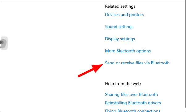 To share files over Bluetooth, select ‘Send or receive files via Bluetooth’ in the Bluetooth & other devices tab.