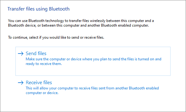 The ‘Bluetooth File Transfer’ window will open. If you want to share a file, select the first option or select the second one if you want to receive a file.