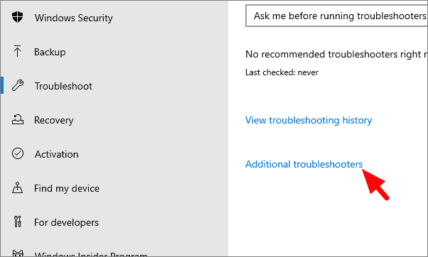 If the troubleshooter options are not displayed on this window, click on ‘Additional troubleshooter’.