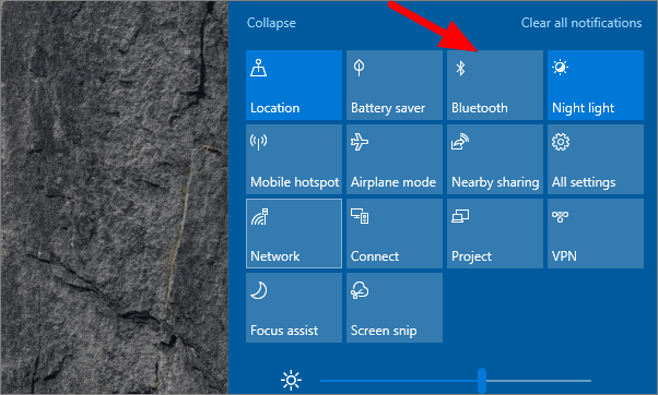 In Action Center, click on the Bluetooth tile in the first row to turn it on. When Bluetooth is turned on, the color of the tile changes from light to dark.