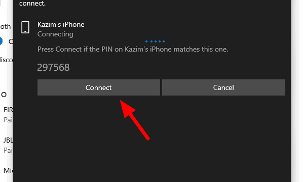 Click on ‘Connect’ to pair the device. Also, if you are pairing with a mobile phone or a similar device, you will have to approve the pairing on that device as well. You have to check the PIN while pairing with some devices, while in the case of other devices, you will not have to verify the PIN, and just click on connect to pair.