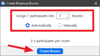 On the breakout room pop-up dialogue, you could choose the number of rooms you wish to divide the participants into. Click on the box next to ‘Assign participants into’ option and enter the number of breakout rooms you want to create.