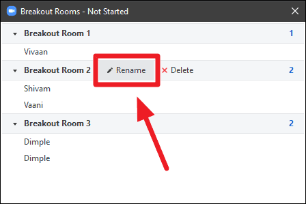 By default, the Breakout Rooms will be named as ‘Breakout Room 1’, ‘Breakout Room 2’, and so on. You can rename the breakout rooms by hovering the mouse cursor over the room name and selecting the ‘Rename’ option.