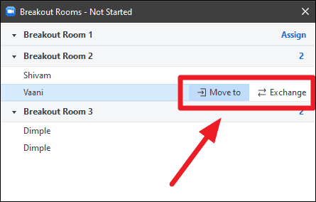 If the automatic arrangement by Zoom doesn’t look good to you, you can move or exchange participants between the breakout rooms by hovering over the participants’ name and selecting either the ‘Move to’ or ‘Exchange’ options.