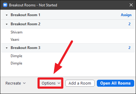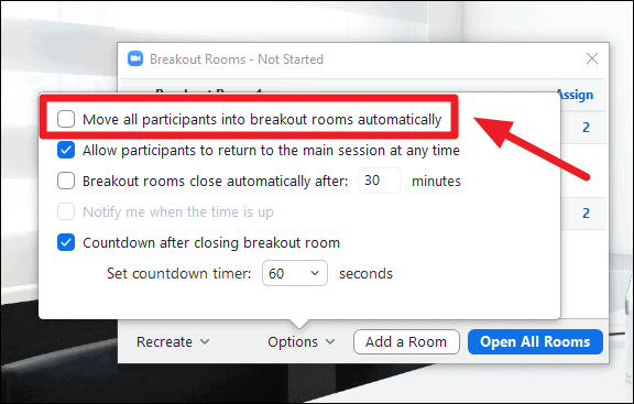 To further customize breakout rooms for your meeting, click on the ‘Options’ button at the bottom of the breakout rooms dialogue.