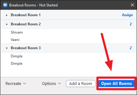 Finally, start the Breakout Session by opening all breakout rooms for the participants to join and start working on the group assignment. Click on the ‘Open All Rooms’ button at the bottom.