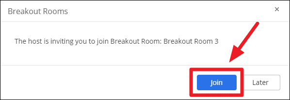 If you did not enable the option to automatically join the participants into the breakout rooms, the participants would see the following dialogue box on their Zoom meeting screens to join the breakout room created for them.