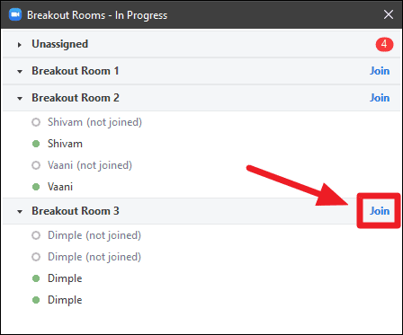 At this point, as a host, you could also choose the join a breakout room to surveillance or help the participants about something. On the Breakout Rooms configuration window, click on the ‘Join’ button next to the Room you wish to join.