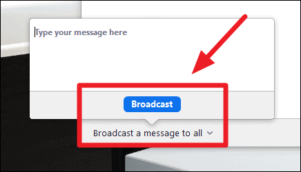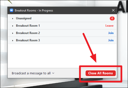 Once your breakout rooms are open, and all participants have joined their respective rooms, you could send a broadcast message to all of them by clicking on the ‘Broadcast a message to all’ button on the Breakout Rooms window.