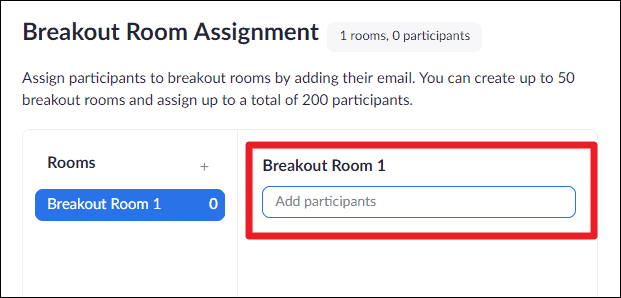 Once a room is created, click on the ‘Add participants’ field box to type participant names and pre-assign them to the breakout room.