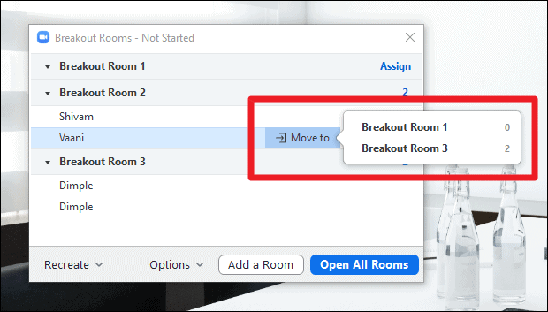 To move a particular participant to another room, click on the ‘Move To’ button next to the person’s name (after hovering) and select the room you’d like to assign for them.