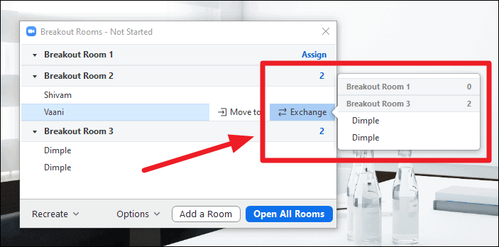 Likewise, swap a participant with someone from a different room by selecting the ‘Exchange’ option next to their name.