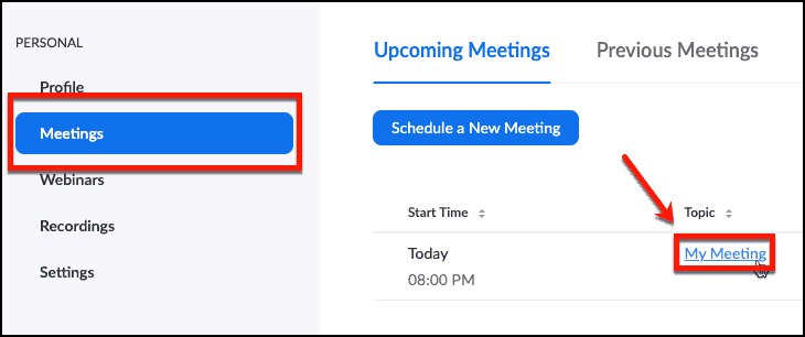Once that’s done, scroll all the way up and select the ‘Meetings’ option under the ‘Personal’ section. Then, select any meeting too which you’d like to add Breakout Rooms under the ‘Upcoming Meetings’ list.
