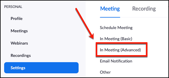 If you’ve admin access on your Zoom account, then go to zoom.us/profile, click on the ‘Settings’ option under the ‘Personal’ section on the left-hand side, and click on the ‘In Meeting (Advanced)’ option on the right to proceed.