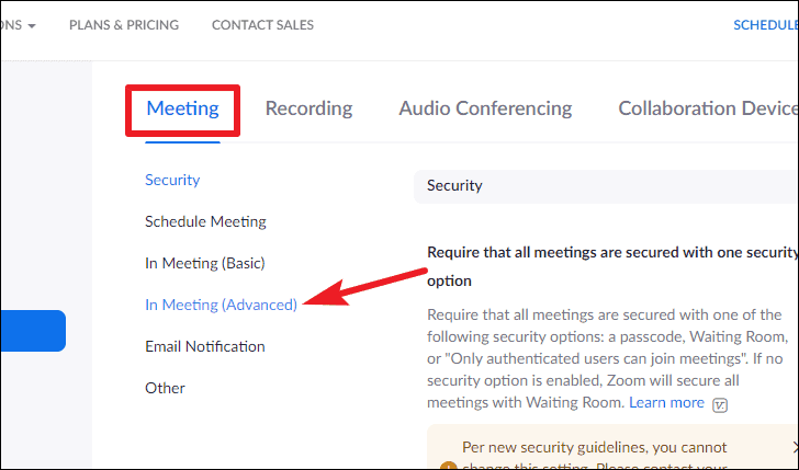 While you’re on the Meetings tab, click the ‘In Meeting (Advanced)’ option from the navigation menu.