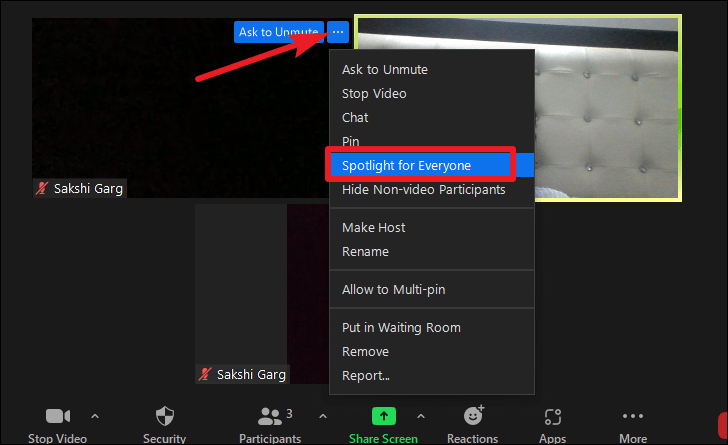 To spotlight the video for a participant, go to their video tile on your screen and click the three-dot icon. Then, select ‘Spotlight for Everyone’ from the menu.