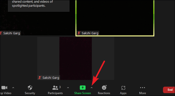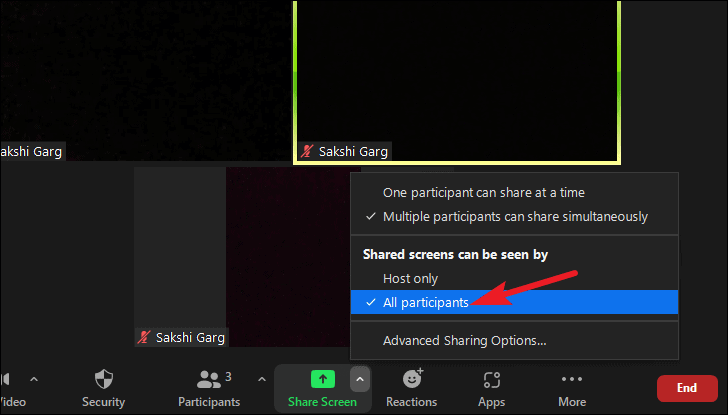 To make a participant’s screen visible to everyone during a screen-sharing session, go to the meeting toolbar and click the arrow next to the ‘Share Screen’ option.
