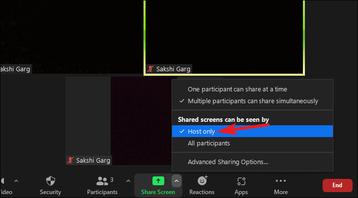 To stop everyone else other than the host and co-hosts from seeing the screen, select ‘Hosts only’.