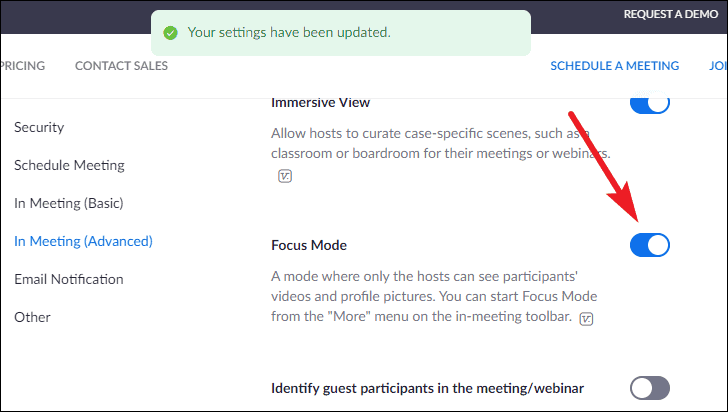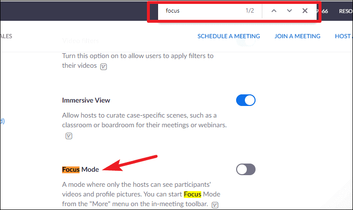Turn on the toggle for ‘Focus Mode’ to enable the option for your meetings.