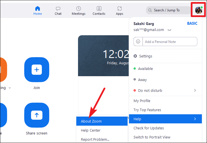 To check the version of your desktop app, go to your profile icon. From the menu that appears, go to ‘Help’ and then click ‘About Zoom’ from the sub-menu.