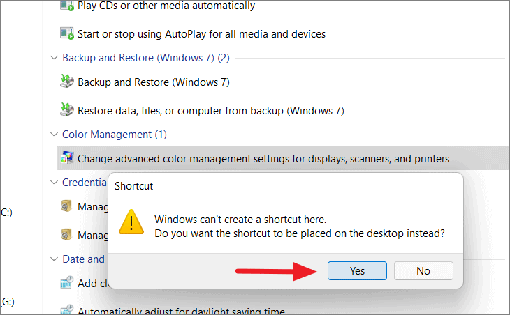 A prompt will appear indicating that Windows cannot create a shortcut in this location and will ask if you want to place the shortcut on the desktop instead. Click 'Yes' to confirm.