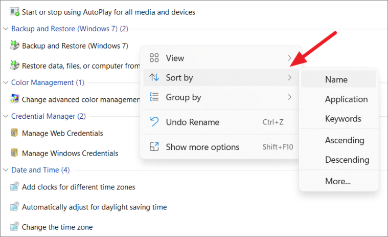 You can also adjust the sorting by right-clicking an empty area, hovering over 'Sort by', and choosing your preferred sorting option.