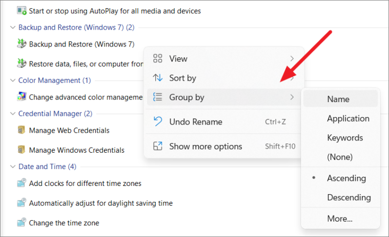 You can customize how the settings are displayed within the God Mode folder to suit your preferences. By default, items are grouped into categories and sorted alphabetically within each category. If you prefer a different arrangement, you can change the grouping and sorting options.
