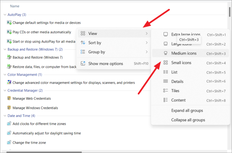 If you prefer viewing the settings as icons rather than a list, you can change the view mode. Right-click on an empty space, hover over 'View', and select 'Medium icons' or 'Large icons' to see the entries as clickable icons.