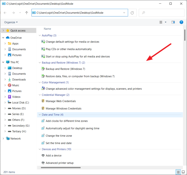 God Mode offers options for tasks such as managing user accounts, adjusting power settings, creating system restore points, updating drivers, and configuring the firewall—all from one location.