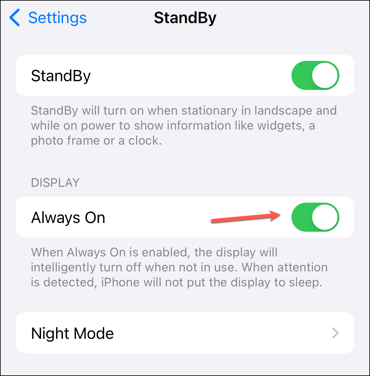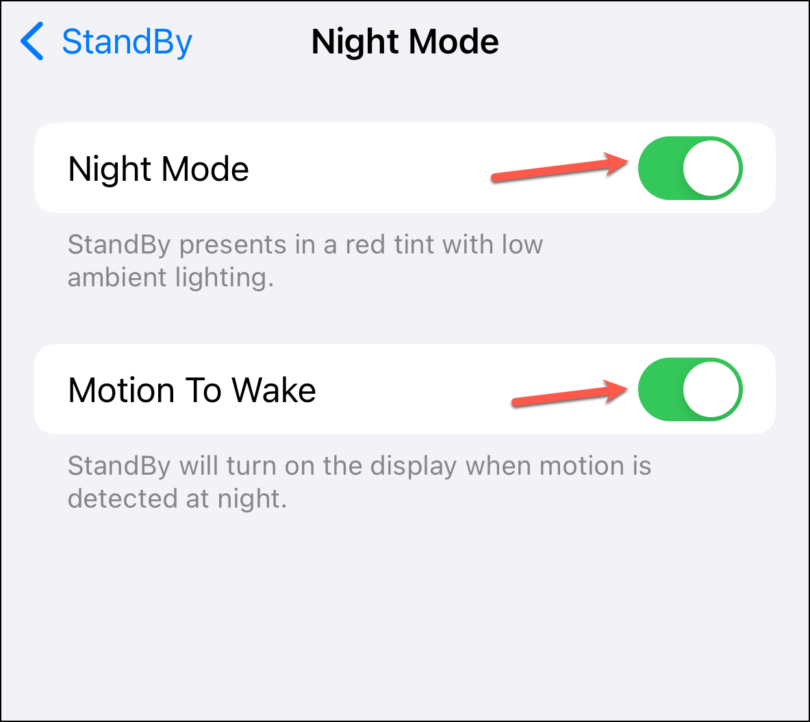 The Night Mode option lets you control whether you want StandBy to kick into Night Mode in low light (red tint) and whether the Display should wake when it detects motion at night.