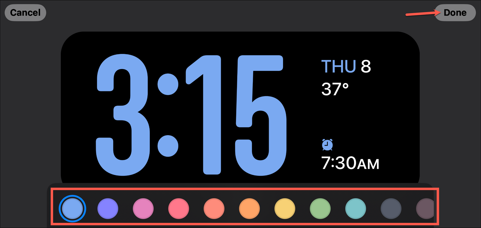 To edit the Clock, tap and hold the screen. Your iPhone will need to authenticate using FaceID or passcode. Editing mode will open. Then, tap the 'circle' in the bottom right to change the color of the clock, where applicable.