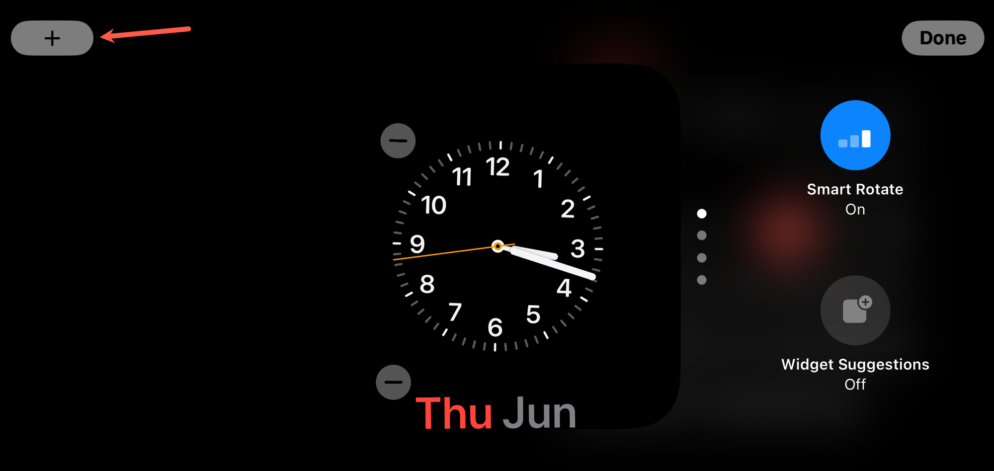 To add a widget to the stack, tap the '+' icon in the top left.