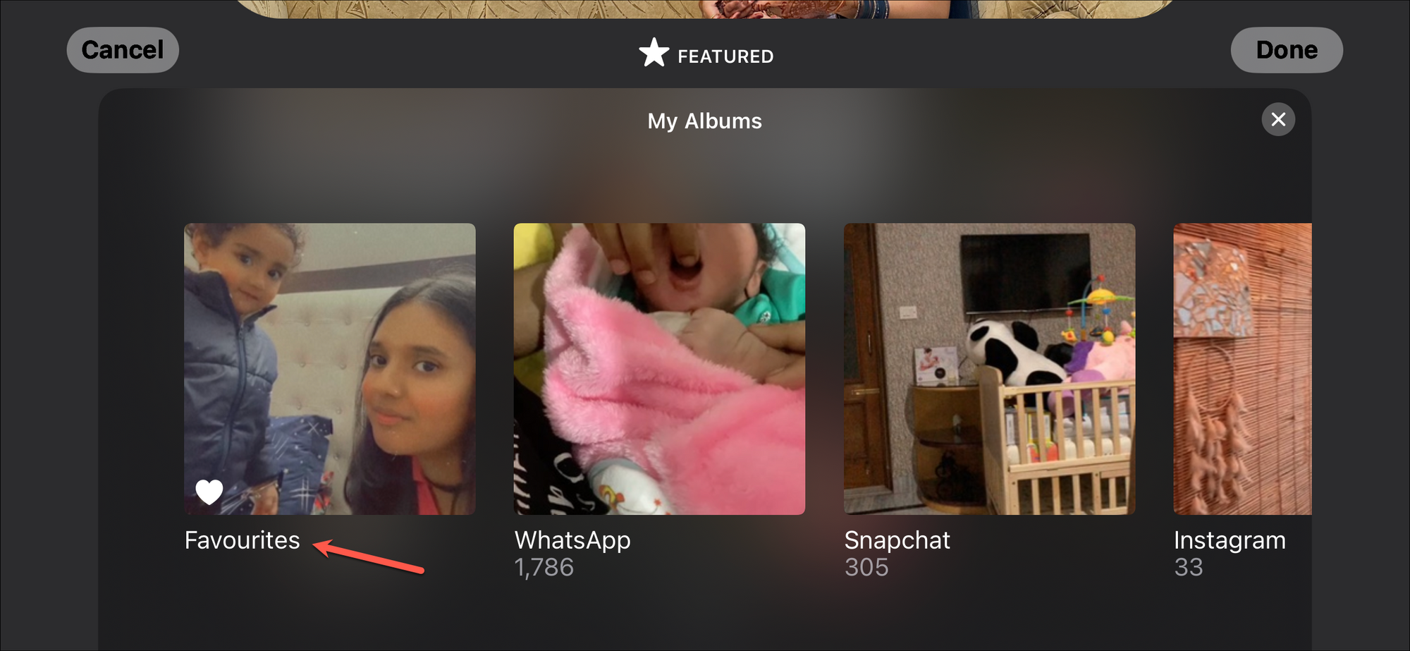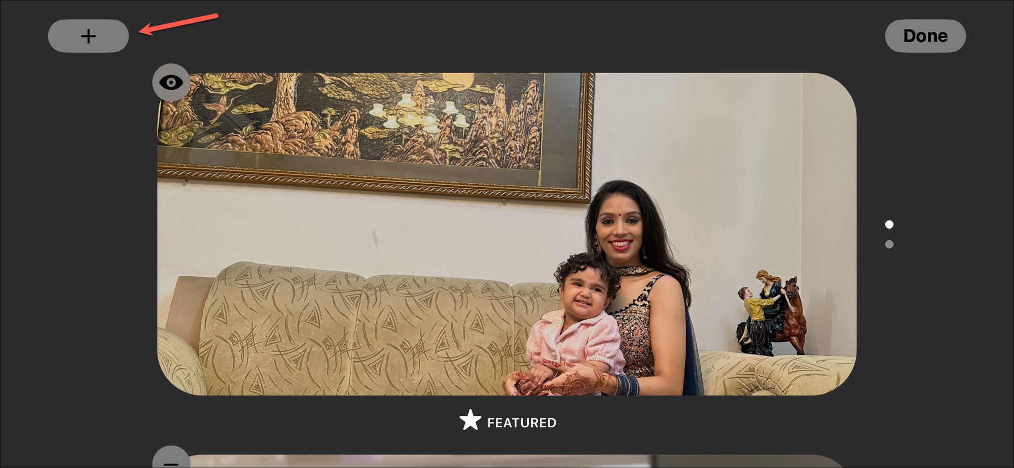 Now, you can also edit the Photos screen. By default, Photos show the pictures in the 'Featured' section that the iPhone intelligently curates. But you can also add any album you want to.