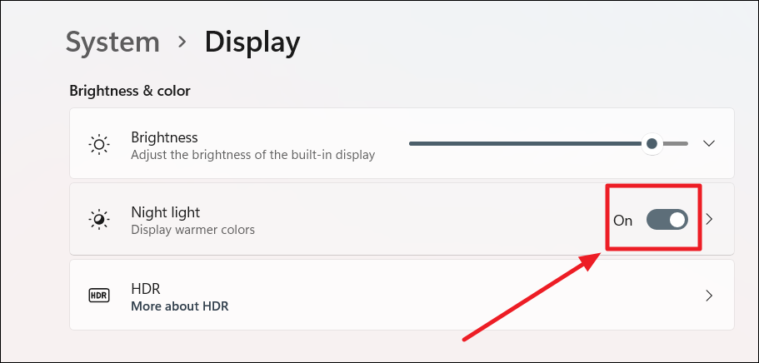 - Under the Brightness & color section, find the Night light option and toggle it to On.