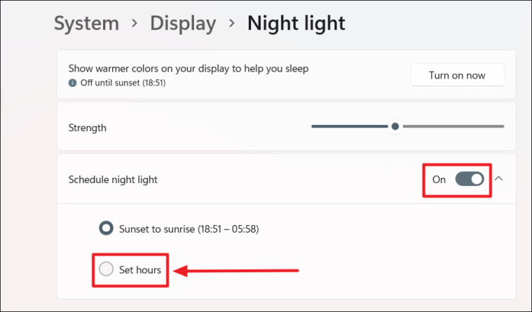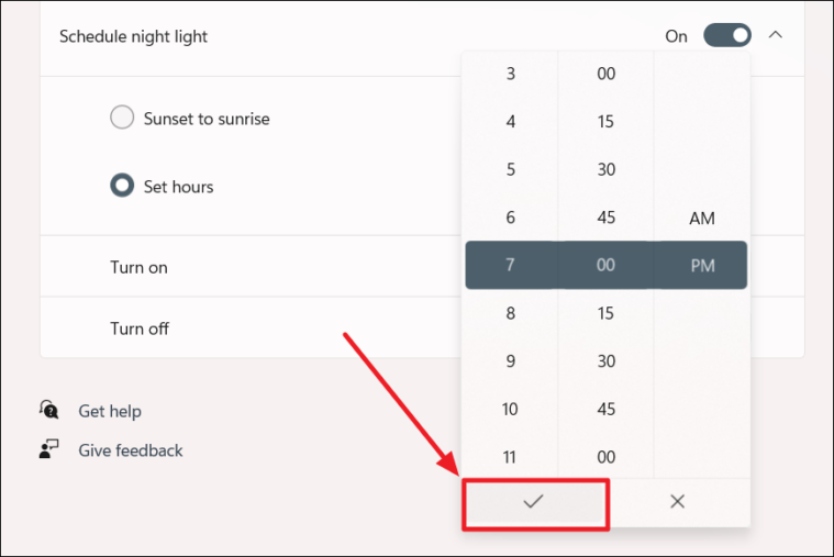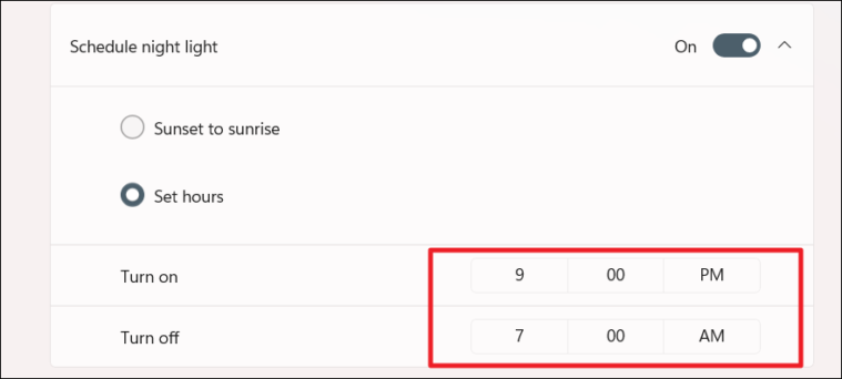 - Under Set hours, click on the time next to Turn on and select when you want Night Light to activate.