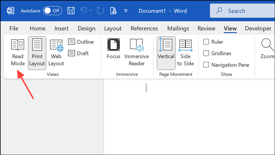 Step 2: Click Read Mode on the far left of the ribbon. Alternatively, you can click the book icon in the lower right corner of your Word window. The document will immediately switch to a full-screen reading layout, hiding most editing tools and menus.
