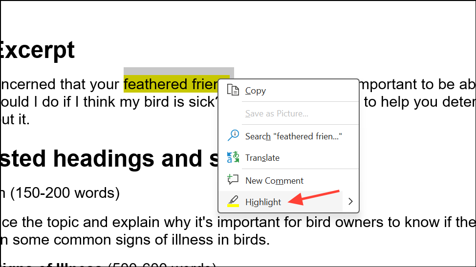 - Highlight text by selecting it, right-clicking, and choosing Highlight. You can pick from several highlight colors.