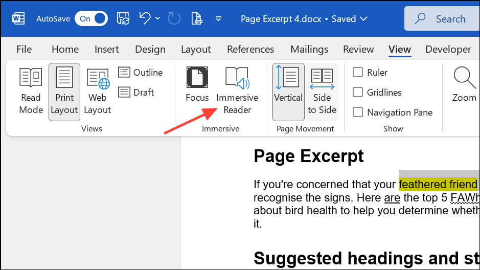 Step 1: Open your document and select the View tab. Click Immersive Reader to launch a full-screen, distraction-free reading experience.