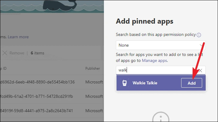 A pane to add apps will appear on the right. Search for ‘Walkie Talkie’ and click the ‘Add’ button when the option appears.