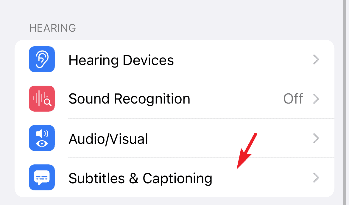 After that, on the ‘Accessibility’ screen, scroll down to locate the ‘Hearing’ section. Then, tap on the ‘Subtitles & Captioning’ tab present under it to continue.