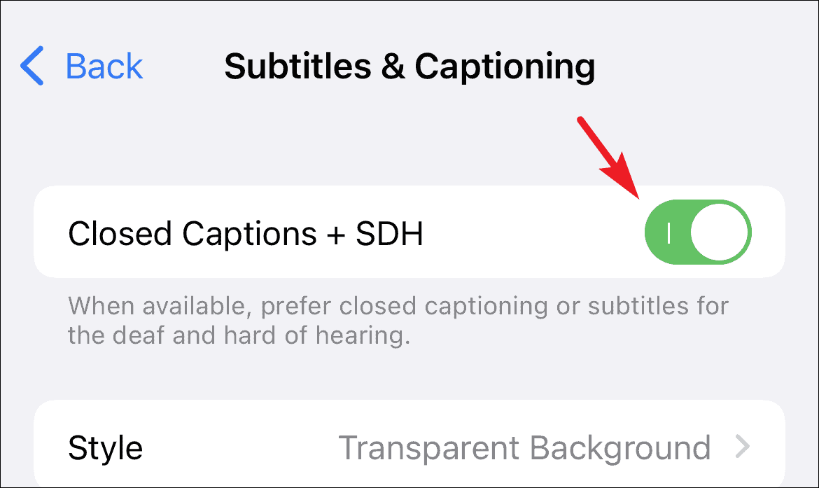 Next, locate the ‘Close Captions + SDH’ option and tap on the switch following the option to bring it to the ‘On’ position.