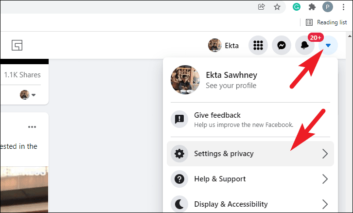 Next, click on the chevron (downward arrow) present in the top right corner of the webpage. Then, select the ‘Settings & privacy’ option from the overflow menu.