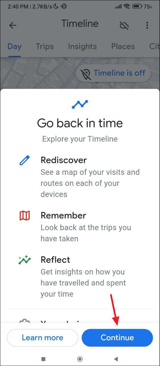 - If you're checking your Timeline for the first time, scroll down and tap on the 'Continue' button.