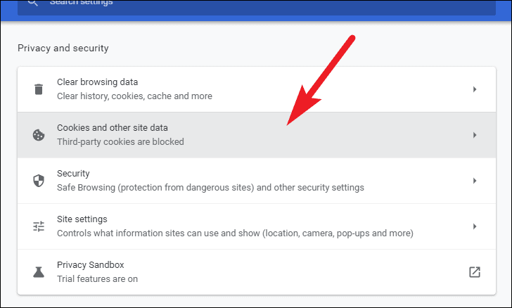 Now, click on the ‘Cookies and other site data’ tile from the list of options.
