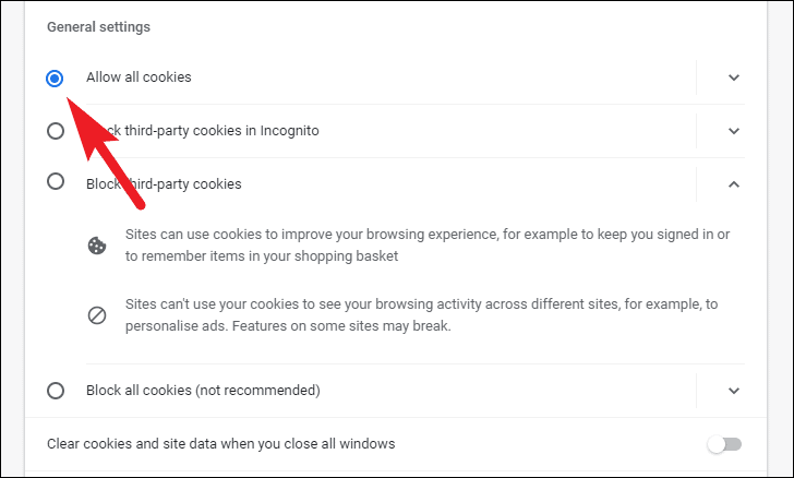 - Block all cookies: If chosen, websites would not be able to save your preferences, passwords, or even remeber the items added in your cart. Many websites may not even work properly.