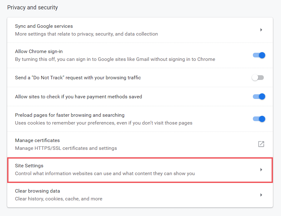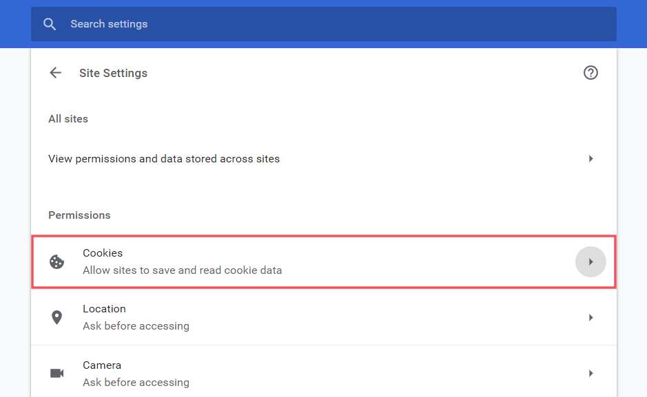 Under the Site Settings menu, click Cookies under the Permissions section to access Chrome’s Cookies settings.